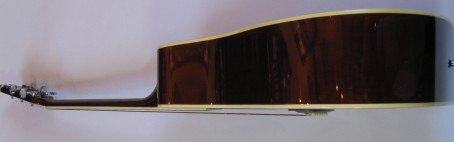 Diese Gitarre habe ich in einem Internetmusikshop über Ebay ersteigert. Ich habe € 53,- dafür bezahlt. Meine Erwartungen waren also nicht besonders hoch gesteckt. Um einen Preisvergleich zu haben: für eine aus Sperrholz gefertigte Yamaha Westerngitarre, z.B. die FX340CF mit Cutaway und Tonholzdecke, bezahlt man etwa € 250,-. Als ich die Gitarre nach 7 Tagen per DHL bekommen habe, war ich angenehm überrascht. Sie war sehr gut verpackt und nach dem auspacken hat sich mir ein angenehmes Bild dargeboten. Das Instrument macht optisch (siehe Fotos) einen sehr vernünftigen Eindruck. Die Lackierung ist ohne sofort sichtbare Fehler, die auf Perlmutt getrimmten Kunststoffbindings (Randverziehrungen) sind ordentlich und gleichmäßig eingearbeitet und die Verleimung ist ebenfalls in Ordnung. Die aufgezogenen Saiten allerdings waren von so miserabler Qualität, dass ein einmaliges bespielen gereicht hat, um am nächsten Tag dunkle Flecken als Korrosionsansatz auf der Oberfläche des Metalls zu finden. Da die Saitenlage eingestellt werden musste, habe ich die Saiten natürlich sofort gegen neue (Daddario, medium light) ersetzt. Nach Optimierung der Saitenlage bin ich auf ein Maß von 2 mm am 1. Bund und 4,5 mm am 14. Bund gekommen. Die Einstellschraube am oberen Block machte keinen sehr vertrauenswürdigen Eindruck, weshalb ich auch eine höhere Spannung vermieden habe. Obwohl ich den Hals gerne noch etwas tiefer gehabt hätte, um in den höheren Bundlagen etwas dichter an das Griffbrett zu kommen. Die Bundstäbe sind gleichmäßig und sauber gearbeitet, nur leider nicht poliert. Ich habe im 2., 5. und 9.Bund noch etwas nachgefeilt und sie dann poliert. Das Griffbrett war mit Lackresten verschmutzt, die ich aber mit etwas feiner Stahlwolle leicht weg bekam, es ist aus Rosenholz und sehr sauber verarbeitet. An einigen Stellen, am ganzen Instrument, habe ich Klebereste und Lackreste entfernen müssen, die dort nicht hingehörten. Die Mechaniken sehen auf den ersten Blick sehr schön aus, sprechen aber zu stark an. Dies soll heißen, die Übersetzung ist zu niedrig. Außerdem ist das Chrom sehr minderwertig.