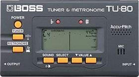Der BOSS TU 80 ist ein chromatisches Stimmgerät mit Metronom Funktion und Tongenerator. Kommen wir zuerst einmal zu dem, was in allen Anwendungsbereichen des Gerätes von Bedeutung ist. Das Display ist auch aus einem steilen Winkel in jede Richtung gut ablesbar. Auch bei Sonneneinstrahlung oder hellem Licht ist ein ablesen mit leichten Einschränkungen möglich. Allerdings ist es nicht beleuchtet und somit nur im Hellen zu gebrauchen. Als Ablesehilfe gibt es zwei zusätzliche Möglichkeiten. Zum Einen ist auf der Rückseite des Gerätes ein Schlitz, in den man eine Münze (eine 20ct. Münze passt sehr gut) einstecken kann, damit das Gerät etwas schräg steht. Zum Anderen sind zwei Leuchtdioden eingebaut, die im Tunermodus anzeigen ob die Seite höher oder tiefer muss, bei exakter Stimmung leuchten beide Dioden. Die Einstellmöglichkeiten im Tunermodus sind: Chromatik, Guitar, Bass, sowie die Einstellung des Referenztones (Kammertons A) zwischen 435Hz - 446 Hz in 1Hz Schritten und Flattuning bis zu 5 Halbtönen. Im chromatischen Bereich erkennt das Gerät die Töne E0(20,6Hz) - C8 (4186Hz), was für ein Stimmgerät für Gitarre absolut ausreichend ist. In den anderen beiden Modi werden die entsprechenden Standardtunings zugelassen, z.B.: E,A,d,g,h,e für Guitar. Ein Zeiger, sowie die beiden LED´s zeigen an, ob die Saite höher oder tiefer muss. Der Zeiger verhält sich beim Stimmen sehr ruhig und zappelt nicht wild herum, wie ich es bei anderen Geräten schon erlebt habe. Der gerade gestimmte Ton wird im Display als Großbuchstabe mit Vorzeichen und einer Nummer für die Oktavlage angezeigt z.B.: C#6. Die Töne werden für akustische Instrumente über ein Mikrofon aufgenommen und für E-Gitarren oder preamps gibt es einen 6,3mm Klinkeneingang und Ausgang. Um eine Gitarre in Halbtönen tiefer zu stimmen, ohne dabei auf eine mittige Displayanzeige zu verzichten, kann ein Flattunig zwischen 1 - 5 Halbtönen eingestellt werden. Als akustische Hilfe steht ein Tonsignal zur Verfügung, das ertönt wenn die Saite exakt eingestimmt ist. Dieses akustische Signal kann auch abgeschaltet werden. Als Hilfe zum Stimmen nach Gehör ist das Gerät mit einem Tongenerator ausgestattet, der Stimmtöne ausgeben kann.